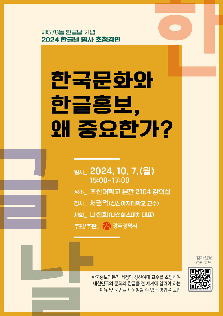 김성배 문화체육실장은 “한글날을 기념하는 이번 행사를 통해 많은 시민이 한글의 소중함을 느끼고, 우리말에 대한 자긍심을 고취하는 시간이 될 것으로 기대한다”며 “시민 여러분의 많은 관심과 참여를 바란다”고 말했다.