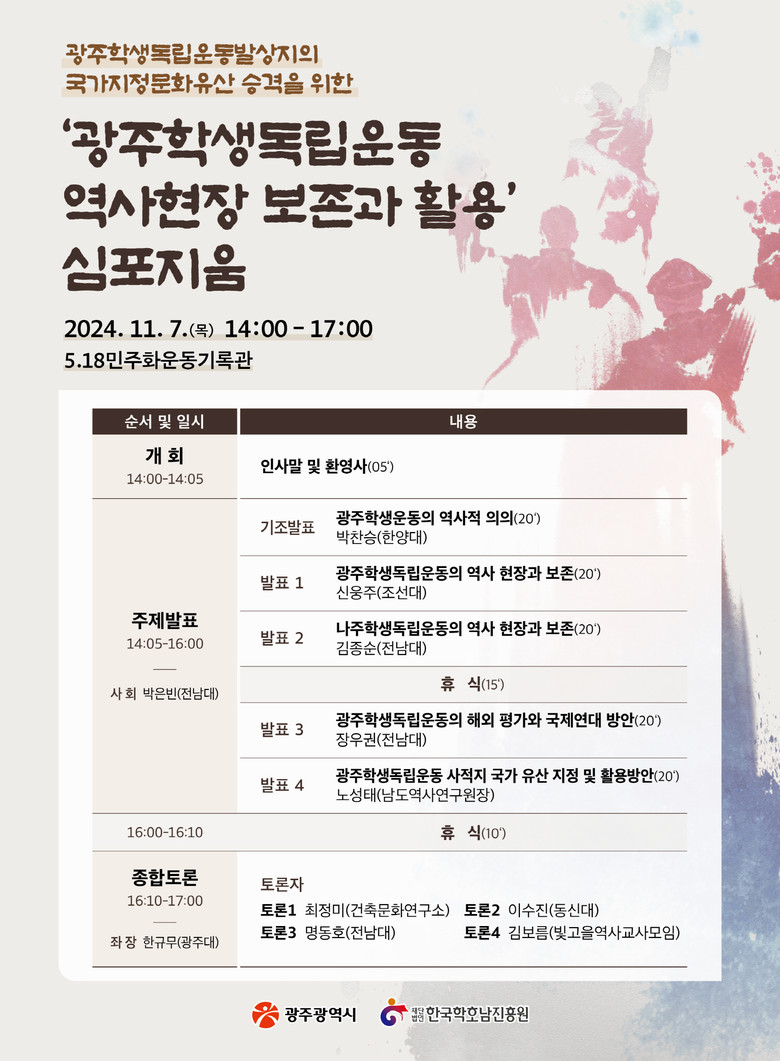 - 학생독립운동 발상지‧진원지 학술‧문화유산 가치 발굴 [광주 세계타임즈=손권일 기자] 광주광역시(시장 강기정)와 (재)한국학호남진흥원은 7일 오후 2시 5·18민주화운동기록관에서 국가지정유산 추진을 위한 ‘광주학생독립운동의 문화유산적 가치 발굴을 위한 심포지엄’을 연다.