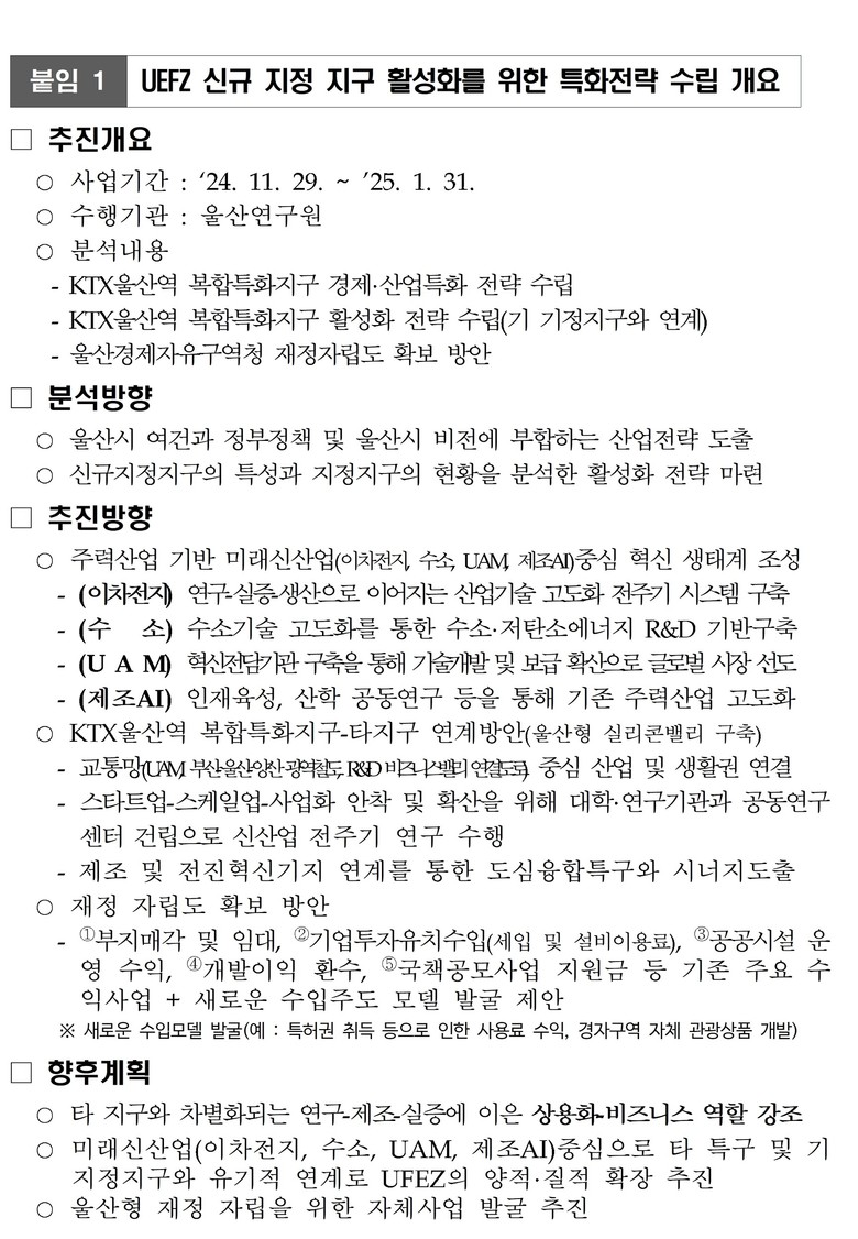 이경식 울산경제자유구역청장은 “케이티엑스(KTX)역세권 복합특화단지의 탄탄한 기반 시설 위에 울산연구원이 제언한 특화전략을 입혀, 단순한 산업단지가 아닌 기업과 인재가 모이는 세계적(글로벌) 혁신 거점으로 완성해 나가겠다”고 말했다.