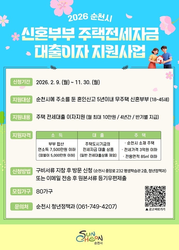 신청 자격은 부부 모두 순천시에 거주하는 18세 이상 45세 이하(1981년~2008년), 부부 합산 연소득 7,500만 원 이하(외벌이는 5,000만 원 이하), 5년 이내 혼인 신고한 무주택 신혼부부이다.