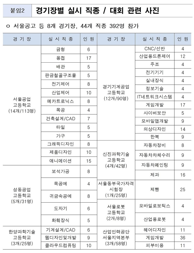 올해 대회에는 특성화고 학생, 산업체 근로자 등 392명의 선수가 참가해 자동차정비, 용접, 사이버보안, 산업용 드론제어 등 44개 직종에서 ‘최고의 기능인’ 타이틀을 놓고 기량을 겨룬다.
