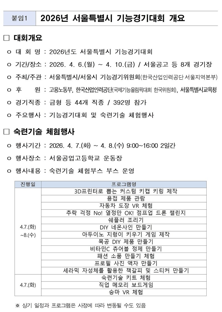 4월 7일(화)부터 8일(수)까지 서울공업고등학교 운동장에서 산업인력공단 주관 프로그램과 서울공고 학과별 체험 부스를 결합해 총 15개 프로그램이 진행된다.