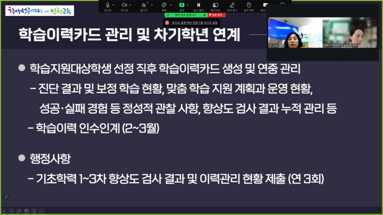 주요 내용은 ▲기초학력 보장 계획 및 예산 활용 점검 ▲학습 지원대상학생 지원협의회 운영 ▲지원 프로그램 미참여 학생 지원 방안 ▲기초학력 보장 프로그램 운영 ▲성장기록 프로그램 활용 방법 등이다.