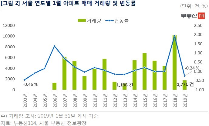 데 가장 큰 폭으로 하락했다. 매매 거래량도 큰 폭으로 줄었다. 1월 서울 아파트 매매 거래량은 1,771건