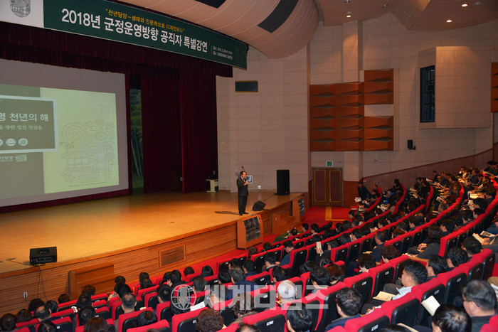 봄을 재촉하는 단비가 내린 지난달 28일, 최형식 담양군수가 ‘2018년 군정운영방향 공직자 특별강연’을 통해 군에서 추진하고 있는 역점과제 및 주요 현안사업을 설명했다.