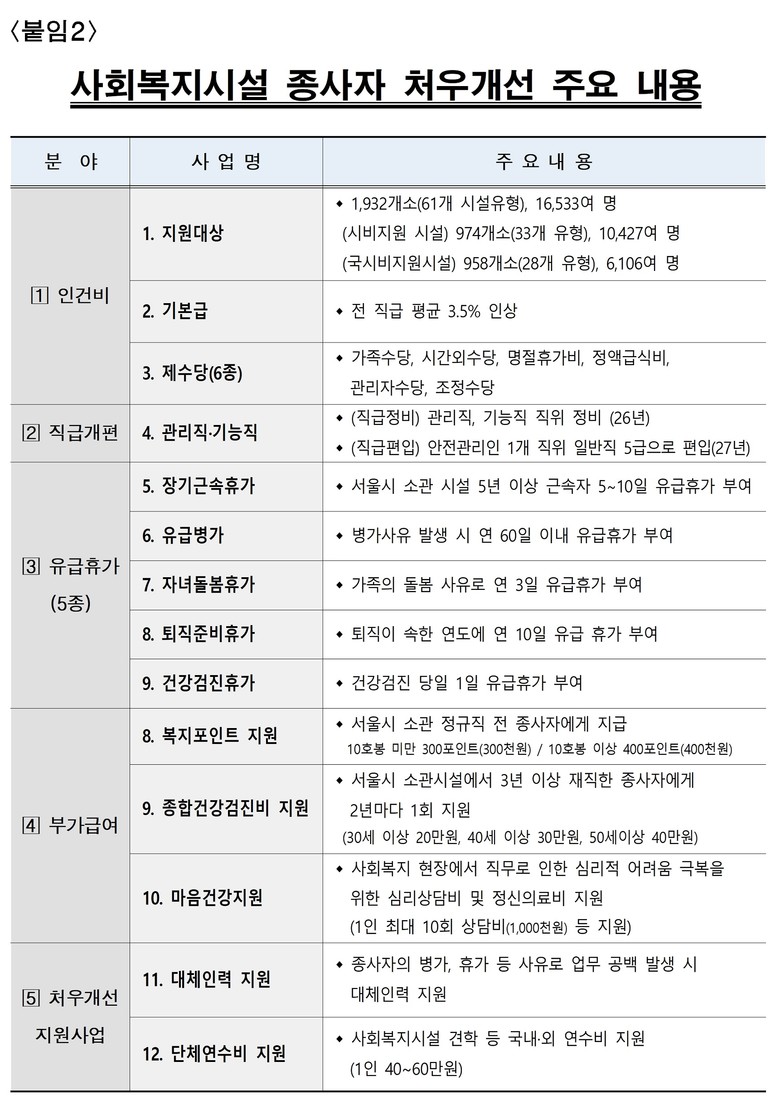 서울시는 복지 수요 증가로 사회복지시설 종사자 업무 강도가 점차 높아지는 현실을 고려해 임금.수당 외에도 종사자 처우를 꾸준히 개선해 왔다.