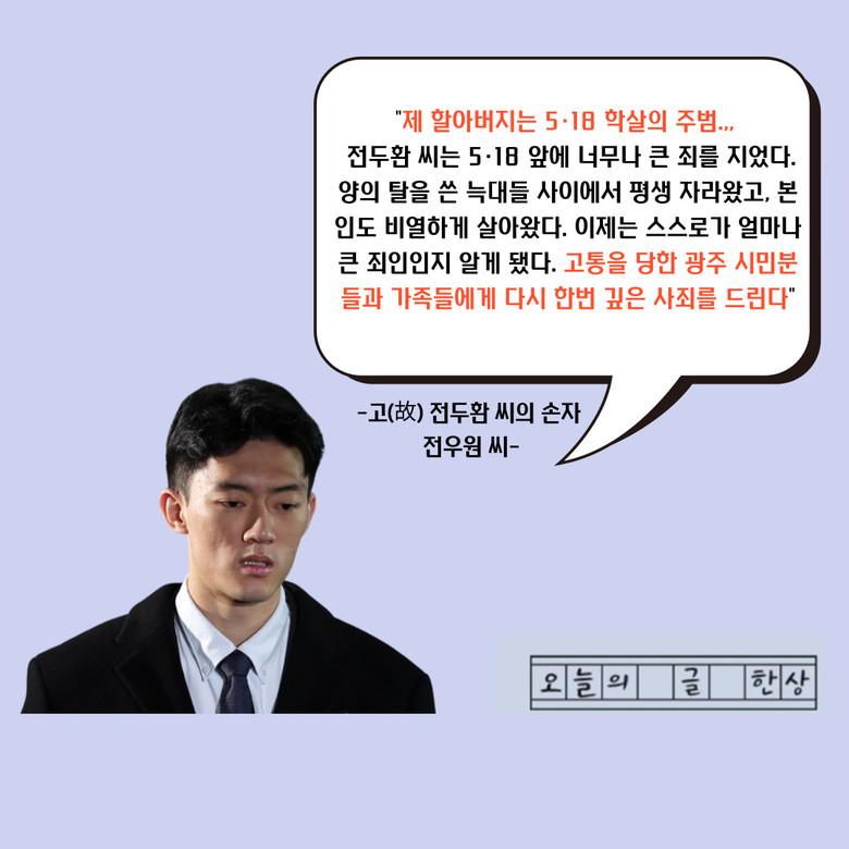 그는 이날 "내 할아버지는 5·18 앞에 씻을 수 없는 큰 죄를 지었다."며 "가족들에게 5·18에 대해 물어보면 대화의 주제를 바꾸거나 오히려 그것은 민주화운동이 아닌 정부를 뒤엎기 위한 폭동이라고 했다"고 덧붙였다.