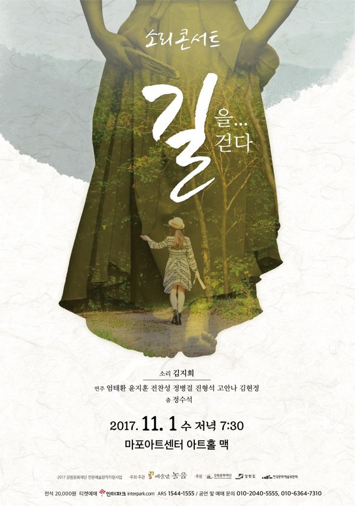 특히 그녀는 이번 공연에 맞춰 사라져가는 강원도 지역의 노동요 등 향토민요를 편곡.수록한 싱글 앨범 ‘길을 걷다’를 냈다. 위의 두 곡을 포함해 총 3곡이 수록돼 있다.