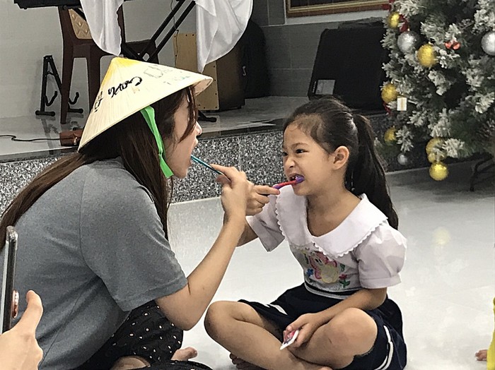 | ▲ 봉사단이 베트남 어린이들에게 구강모형을 이용해 위생교육을 실시한 후, 유디치과에서 후원한 구강용품을 올바른 칫솔질 교육을 하고 있다. |