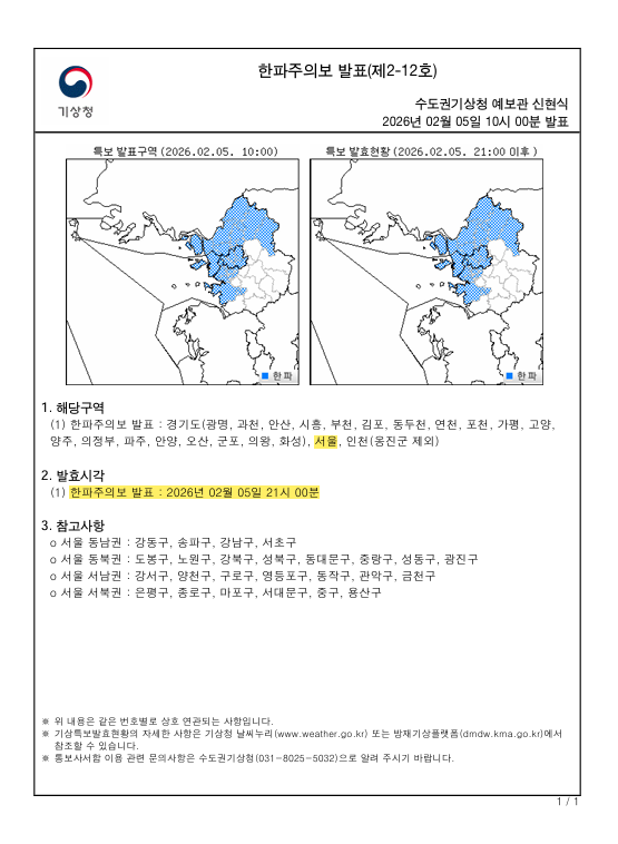 - 시, “한파 피해 없도록 상황관리 강화, 외출시 보온‧건강관리에 각별히 유의” [서울 세계타임즈=이장성 기자] 입춘을 맞아 한풀 꺾였던 추위가 다시 고개를 들 것으로 보인다. 5일(목) 밤 9시를 기점으로 서울 전역(동남권·동북권·서남권·서북권)에 한파주의보가 발효됨에 따라, 서울시는 한파 종합지원상황실을 가동하고 자치구 및 유관기관과 협력해 시민 보호와 취약시설 안전관리를 강화에 나섰다.