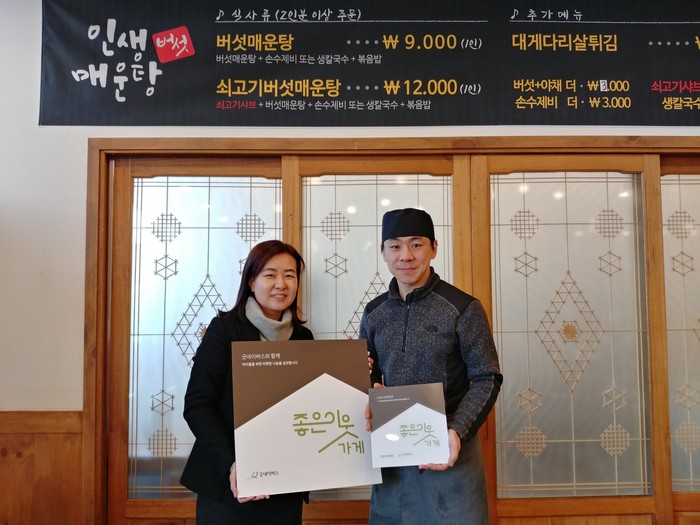 [경기도=세계타임즈 이영진 기자] 굿네이버스 경기2본부(본부장 박정순)는 28일(수), 고양시 덕양구 화정동에 위치한 인생버섯매운탕 (대표 윤혁준, 김진형)에 ‘좋은이웃가게’ 현판을 전달하였다고 밝혔다.