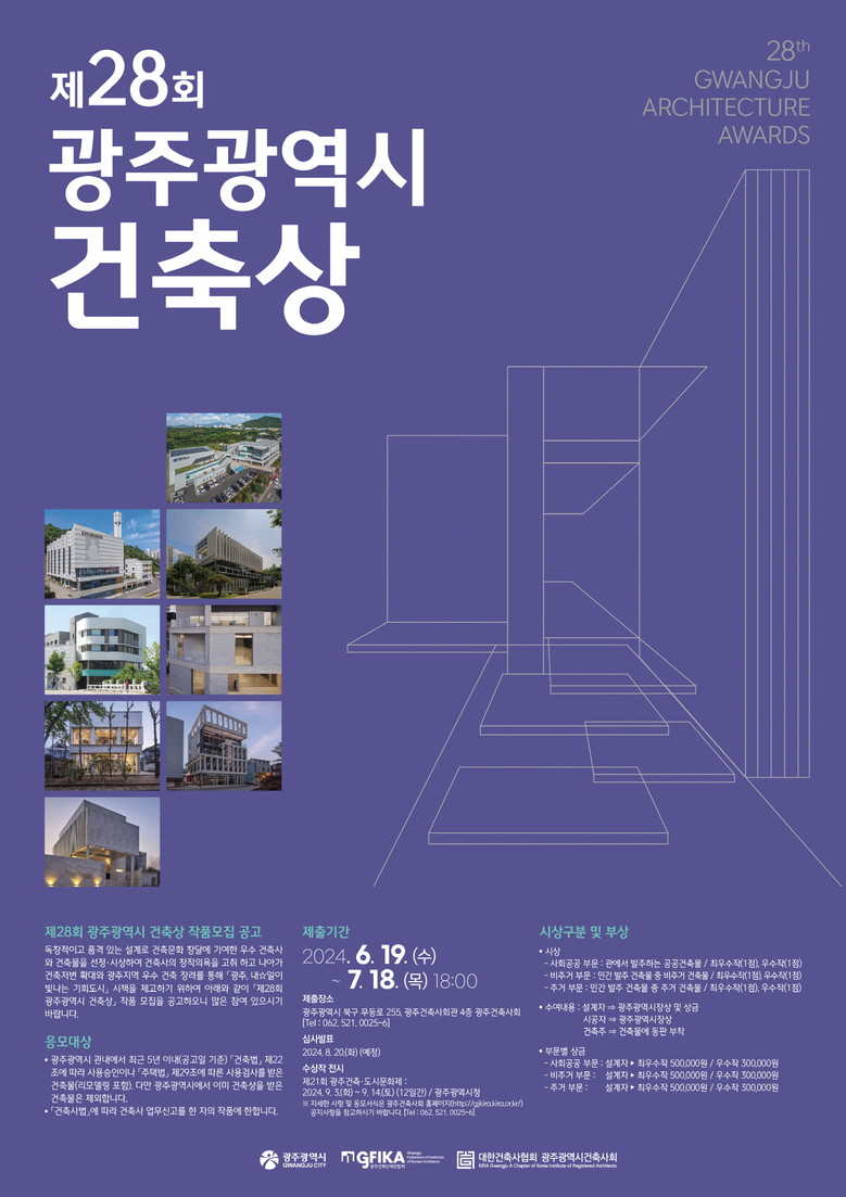 작품 접수는 광주시건축사회 누리집(http://gjkira.kira.or.kr/) 공지사항에서 응모신청서를 내려받아 관련 서류와 A0사이즈 작품축소판(판넬)을 오는 7월 18일까지 건축사회 사무국(광주 북구 무등로 255, 4층)으로 방문해 접수하면 된다.