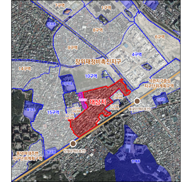 대상지는 6호선 돌곶이역, 상월곡역에 위치하고, 주변에는 전통시장인 장위시장과 장위재정비촉진지구(장위 4구역, 14구역, 15구역)가 입지하고 있으며, 기존 장위재정비촉진지구내 장위제11구역에서 2017년 3월 30일자로 해제되어 정비기반시설이 열악하고 노후불량건축물이 밀집된 지역이다.