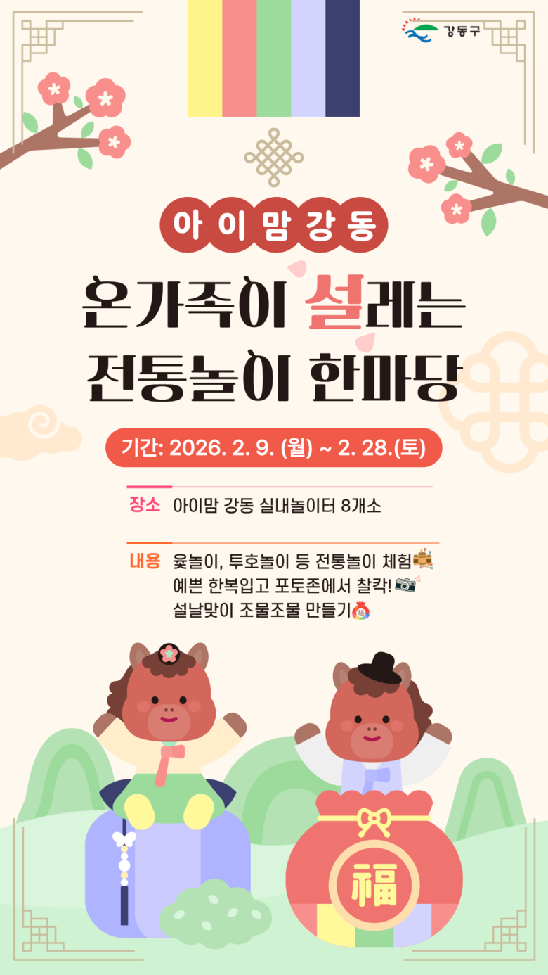 이수희 강동구청장은 “이번 온가족이 설레는 전통놀이 한마당이 놀이와 체험을 통해 우리 전통을 자연스레 익히고 가족 간 유대감을 높이는 계기가 되길 바라며, 앞으로도 다양한 가족 친화 프로그램을 지속적으로 발굴·운영하겠다”고 말했다.