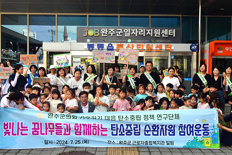 [완주군의회=세계타임즈 이상호 기자] 완주군의회 기후위기 대응 탄소중립 정책연구회(대표의원 심부건)가 25일 봉동읍 둔산리 근로자 종합복지관 앞에서 ‘빛나는 꿈나무들과 함께하는 탄소중립 순환자원 참여운동’을 실시했다.