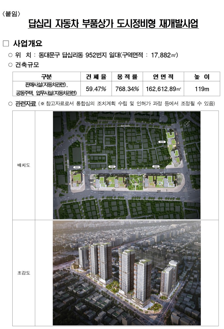답십리 자동차 부품상가는 이번 계획 변경으로 지하9층/지상32층, 용적률 783%에서 지하7층/지상33층, 용적률 768%로 축소되어 지하공사 안정성을 확보하였으며 공동주택은 729세대(공공 147세대)로 공급될 예정이다.