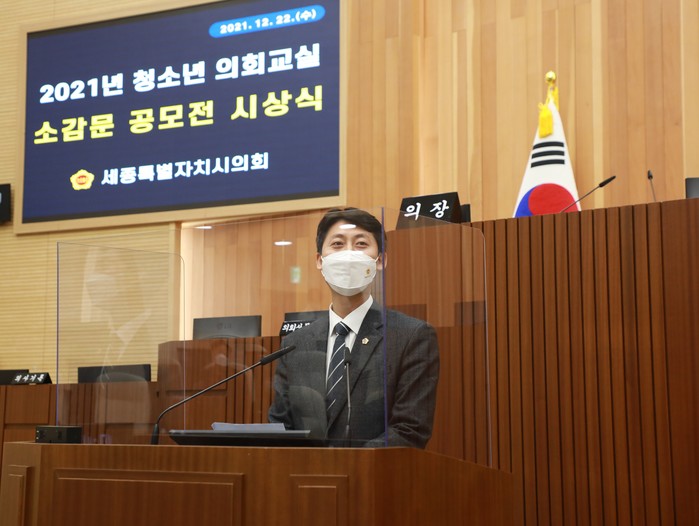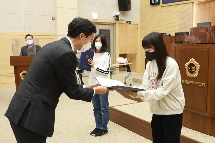 [세종=세계타임즈 이채봉 기자] 세종특별자치시의회(의장 이태환)는 22일 본회의장에서 ‘2021년 청소년 의회교실 소감문 공모전’ 시상식을 개최하고 우수작으로 뽑힌 6명에게 상장을 수여했다.