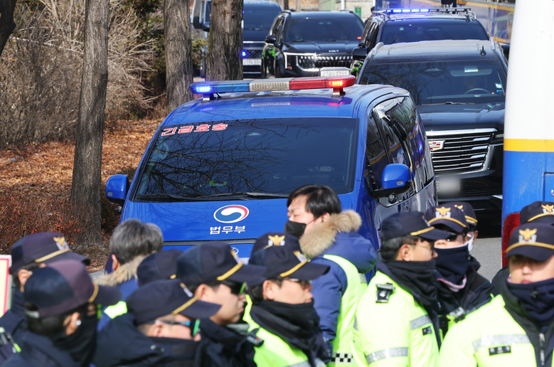 [세계타임즈 = 이채봉 기자] 내란 우두머리 혐의로 체포된 윤석열 대통령이 탑승한 차량 행렬이 18일 경기도 의왕시 서울구치소에서 나와 구속 전 피의자심문(영장실질심사)이 열리는 서울서부지법으로 향하고 있다. 2025.1.18
