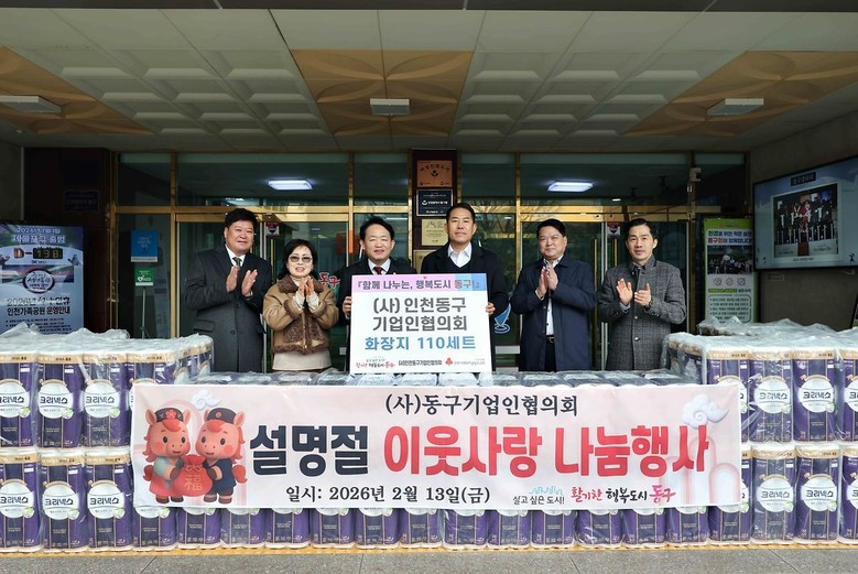 [동구 세계타임즈=심하린 기자] (사)인천동구기업인협의회(회장 장동춘)는 지난 13일‘설맞이 사랑의 물품 나눔’ 휴지 110세트 전달식을 개최했다고 밝혔다.