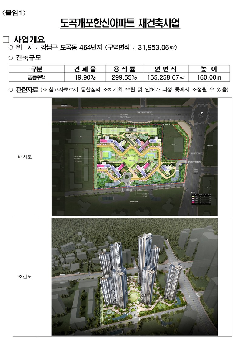 서울시는 12월 18일 제13차 정비사업 통합심의 위원회에서 강남구 도곡동 464번지 ‘도곡개포한신아파트 재건축 사업’을 위한 도시·건축·경관·교통·재해 분야에 대한 심의안을 통합심의해 ‘조건부 의결’ 했다고 밝혔다.