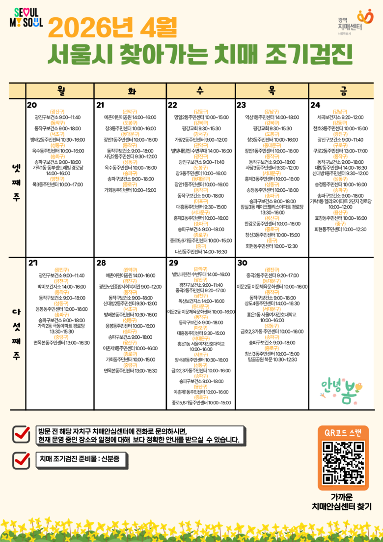 자치구별 세부 일정은 서울시광역치매센터 누리집(seoul.nid.or.kr) 또는 전용 QR코드를 통해 간편하게 확인할 수 있다.