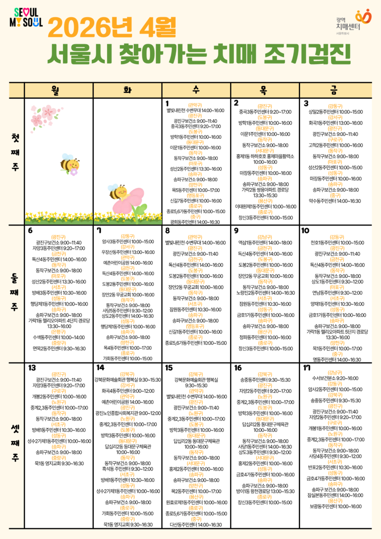 [서울 세계타임즈=이장성 기자] 서울시가 4월을 ‘치매 조기 검진의 달’로 지정하고, 4월 한 달간 60세 이상 시민을 직접 찾아가는 치매 조기 검진을 운영한다. 경로당·복지관 등 생활 가까운 곳에서 누구나 무료로 검사를 받을 수 있도록 해 치매 예방의 ‘골든타임’을 놓치지 않도록 지원할 방침이다.