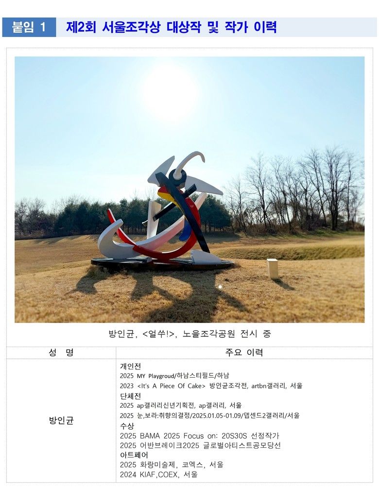 김태희 서울시 문화본부장은 “이번 제2회 서울조각상 대상작이 시민들에게 희망의 에너지를 전하는 계기가 되길 바란다”라며, “앞으로도 조각가들의 실험적인 창작 활동을 적극 지원하고, 시민들이 일상 가까이에서 예술을 향유할 수 있도록 저변 확대에 힘쓰겠다”라고 말했다.
