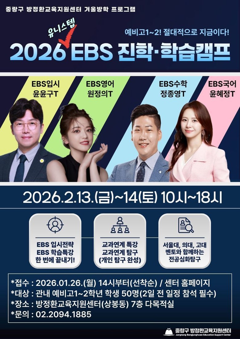 - 핵심 과목 학습 전략 제시 및 교과 연계 탐구 활동 지원 [중랑구 세계타임즈=이장성 기자] 중랑구(구청장 류경기) 방정환교육지원센터가 겨울방학을 맞아 오는 2월 13일~14일 관내 예비 고등학교 1~2학년을 대상으로 ‘2026 EBS 진학·학습 캠프’를 운영한다.
