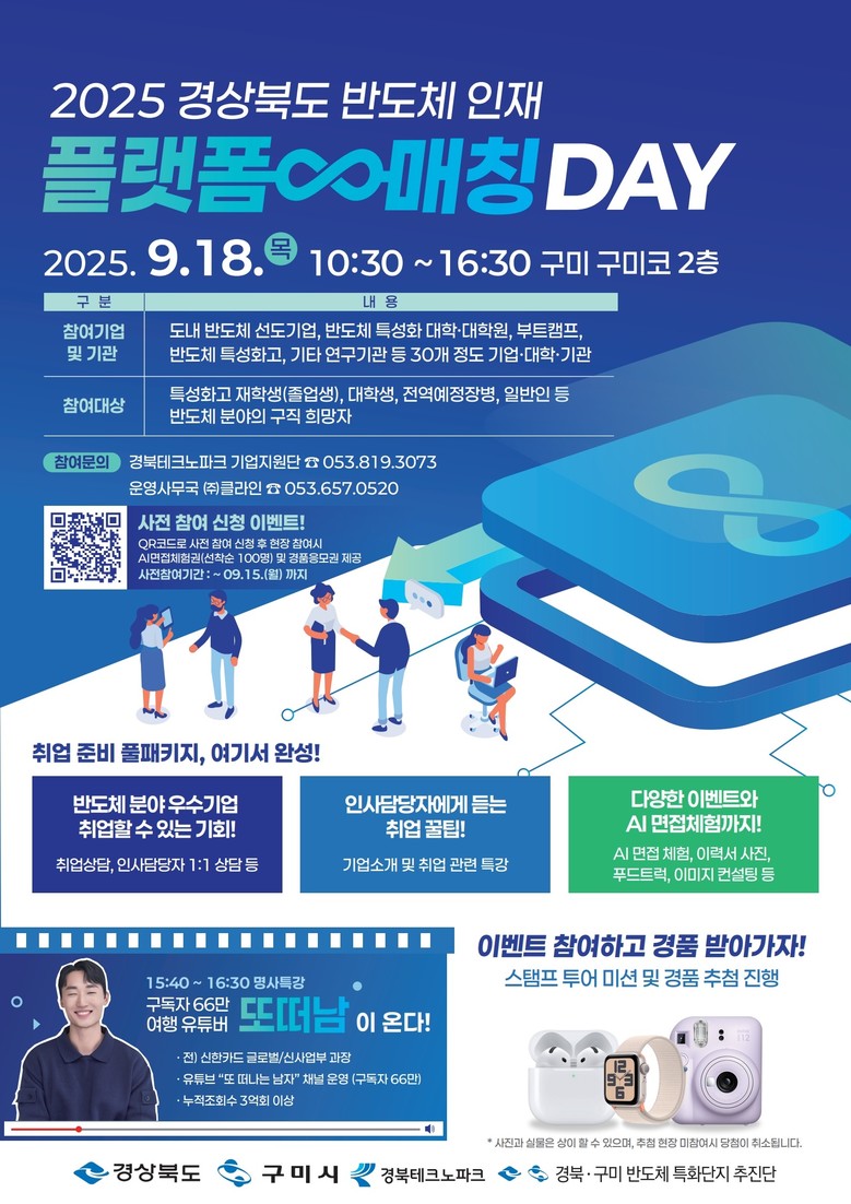 이날 행사는 경북에서 기업과 학교 연합으로 처음 열리는 반도체 분야 취업 박람회로 반도체 분야 진출을 희망하는 대학(원)생, 특성화고 학생, 청년 구직자 등에게 채용 정보와 현장 면접 기회를 제공해 실질적인 취업 가능성을 높이는 동시에 기업은 인재 확보를 위한 맞춤형 채용을 지원하기 위해 마련됐다.