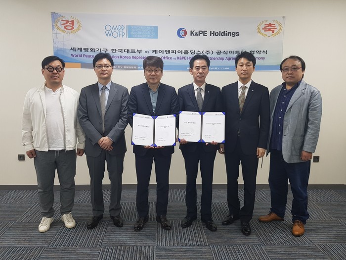 세계평화기구(OMPP/WOFP) 한국대표(유병관 대표)와 케이앤피이홀딩스(주)(김민기 회장)가 4월26일 서울 케이와이헤리티지호텔서 서로의 사업에 협력하는 공식파트너 협약식을 체결했다. 이로써 양 기구 및 회사는 상호간에 지구 환경 및 재해 그리고 난민돕기, 플라즈마 플랜트 사업 확충 등 각종 사업에 함께 하기로 뜻을 모았다.