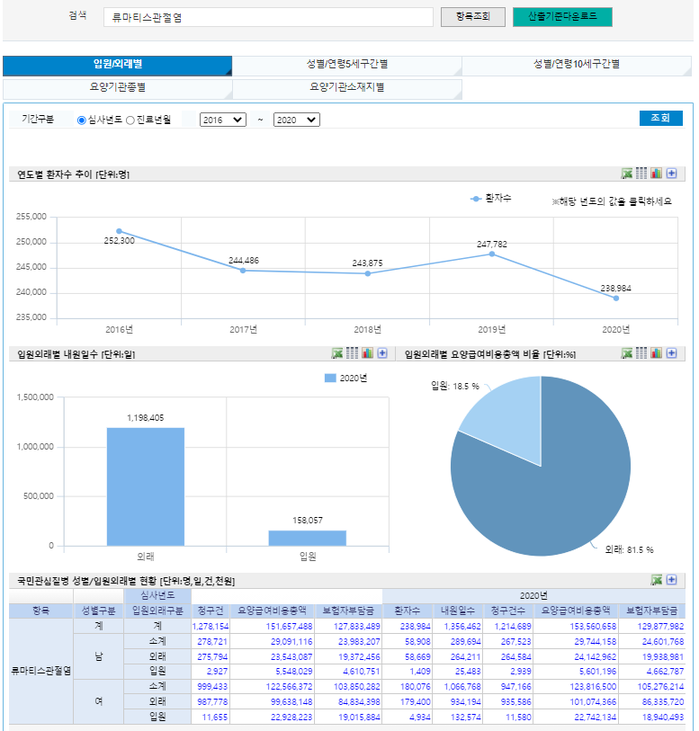 2020년 류마티스 관절염 환자는 24만 여명이었다. 건강보험심사평가원 통계에 의하면 50대와 60대 여성 환자가 전체의 42.9%를 차지하고 있었다. 손가락 마디가 두꺼워지는 등의 관절의 변형으로 인해 30대~40대 여성들도 병원을 많이 찾는다.