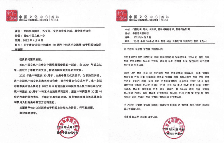 또한 관계자는 "이번 사업의 수주를 위하여 싱하이밍 대사에게 한중미술협회장자격으로 공식 요청하여 주한 중국문화원 공식외교협조공문도 우리의 국회, 외교부, 문체부 등에 보내도록 했다"며 "앞으로 우리협회가 올해 주관하는 아래의 전시에 정부(문화체육관광부) 후원 표시 및 공식로고 사용을 할 수가 있기에, 협회 전시에 참여 협회원들은 향후 개인의 팜플렛이나 이력서에 '한중수교 30주년 기념 작가' 기재와 함께 옆에 정부 공식로고도 첨부할 수가 있게 되었다"고 밝혔다.