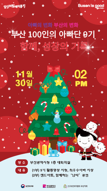 한편, 시와 인구보건복지협회 부산지회가 함께하는 「부산 100인의 아빠단」은 육아에 서툰 초보 아빠들이 다양한 체험활동을 통해 육아에 관한 고민과 비법(노하우)을 공유하는 부산 공식 아빠들의 모임이다.