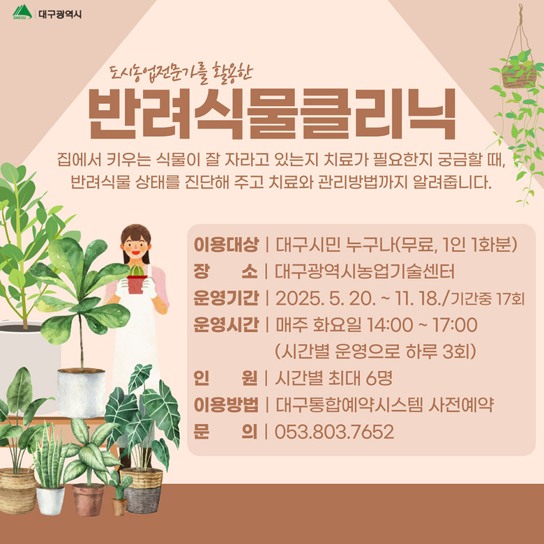 ▸ 대구 시민 누구나 사전 예약을 하면 반려식물 진단·치료 등 컨설팅 및 교육 [세계타임즈=대구 한윤석 기자] 대구광역시농업기술센터(소장 오명숙)는 올해 처음으로 도시농업전문가를 활용한 반려식물클리닉을 5월 20일(화)부터 11월 18일(화)까지 매주 화요일 17회, 농업기술센터 LED식물공장에서 운영한다.