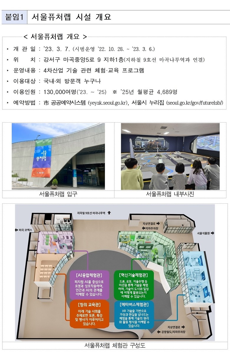 이수연 서울시 경제실장은 “이번 서울퓨처랩 개편은 시민이 첨단기술을 단순히 체험하는 수준을 넘어, 기술의 원리와 사회적 의미까지 이해할 수 있도록 교육 기능을 강화한 데 의의가 있다”며, “앞으로 더 많은 시민들이 서울퓨처랩을 방문해 AI·로봇 등 미래기술을 직접 경험하고 이해하며, 이를 실제 삶과 연결해 활용할 수 있도록 지원하겠다”고 밝혔다.