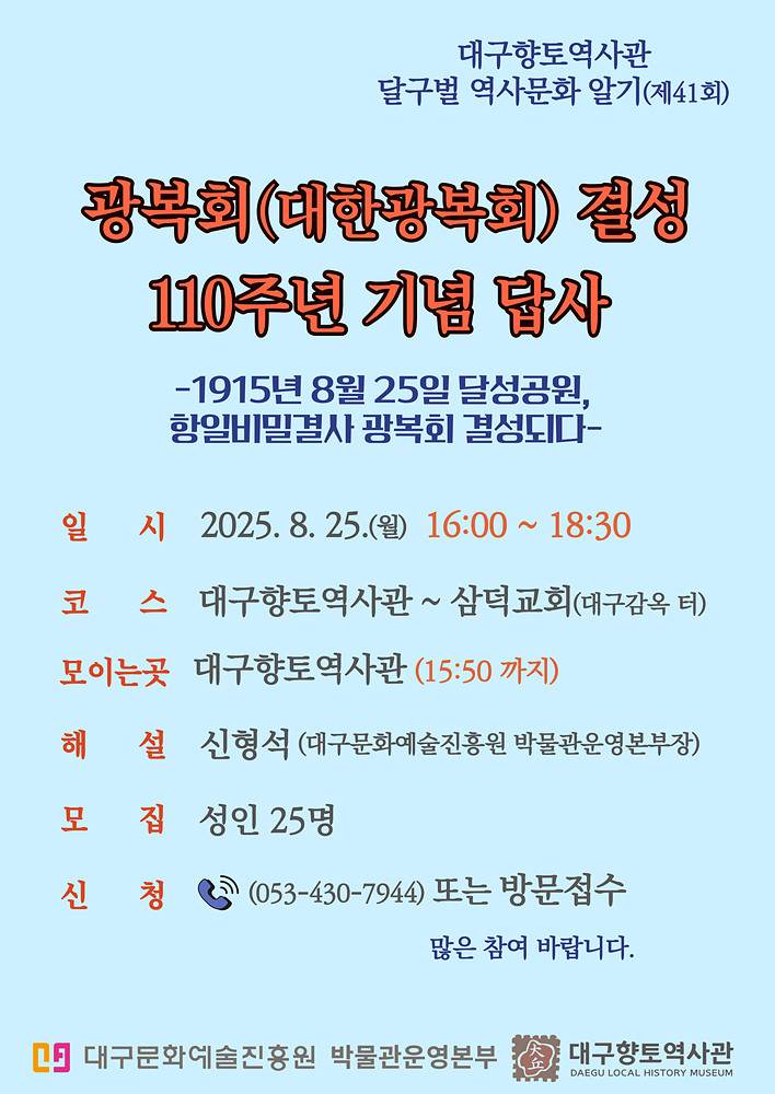 대구향토역사관을 비롯한 대구시 공립박물관 3개관을 총괄하고 있는 신형석 대구문화예술진흥원 박물관운영본부장은 “광복 80주년이자 광복회 결성 110주년을 맞는 올해, 답사에 많이 참여하셔서 대구 속의 독립투쟁 현장을 살펴보며 순국선열들의 나라를 찾기 위한 노력을 기억하고 감사의 시간을 가져보시면 좋을 것”이라며, “대구가 본래 사람이 모이고 새로운 운동이 시작된 ‘열린도시’였다는 사실도 함께 공유했으면 한다”고 말했다.