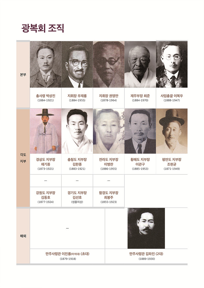 광복회 총사령에는 박상진이 추대되었으며, 그는 이미 1912년부터 대구 중심가 본정(현 서문로)에서 상덕태상회를 운영하며 독립운동의 거점으로 삼고 있었다. 지휘장에 우재룡·권영만, 재무부장 최준(경주 최부자), 사업총괄 이복우, 그리고 8도에는 도별로 각각 지부장을 선임하였다. 해외에는 만주사령관을 임명하였으며, 초대 이진룡(이석대), 2대 김좌진이었다.