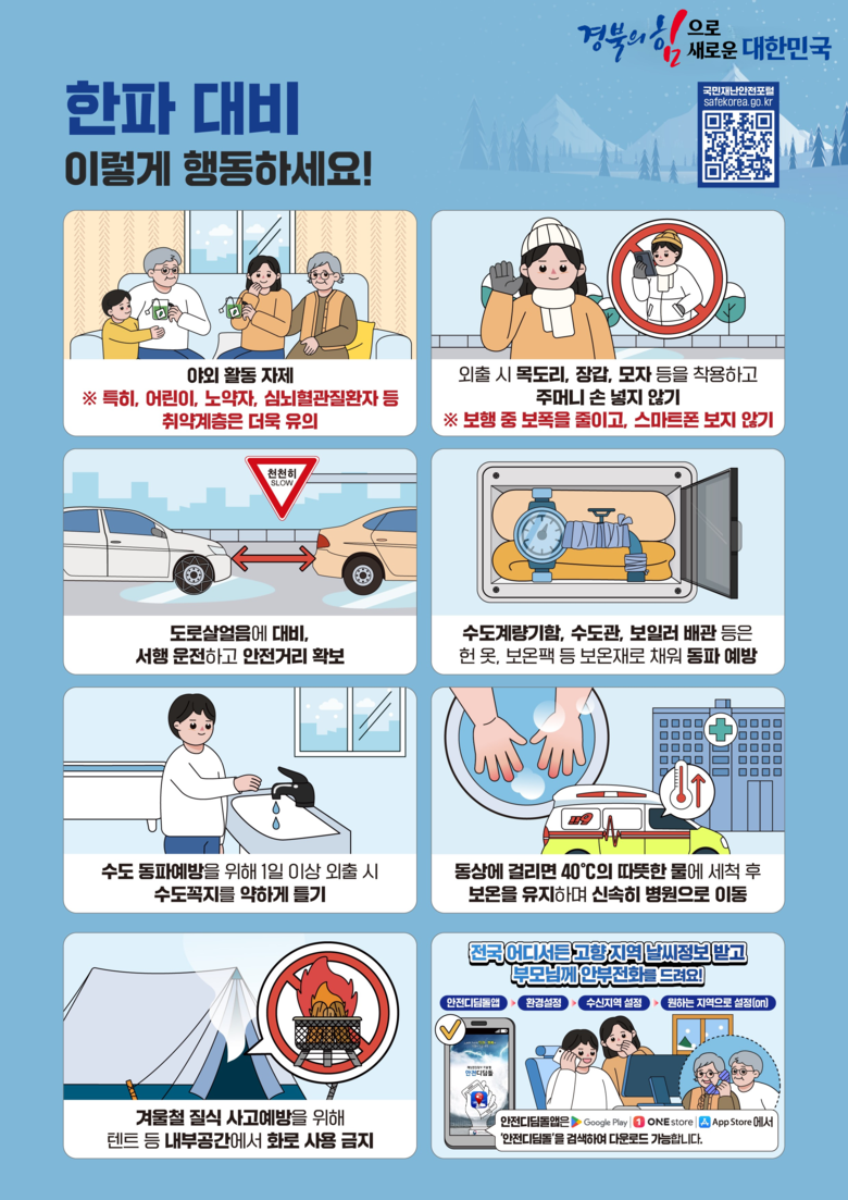 또한 안전행정실장 주관으로 집단부지와 모듈러 임시조립주택을 대상으로 화재 예방 안전교육을 실시하고 빙판길 사고 예방과 동파 방지 조치 이행 여부를 점검하는 등 한파 대비 안전관리에 빈틈없이 준비하고 있다.