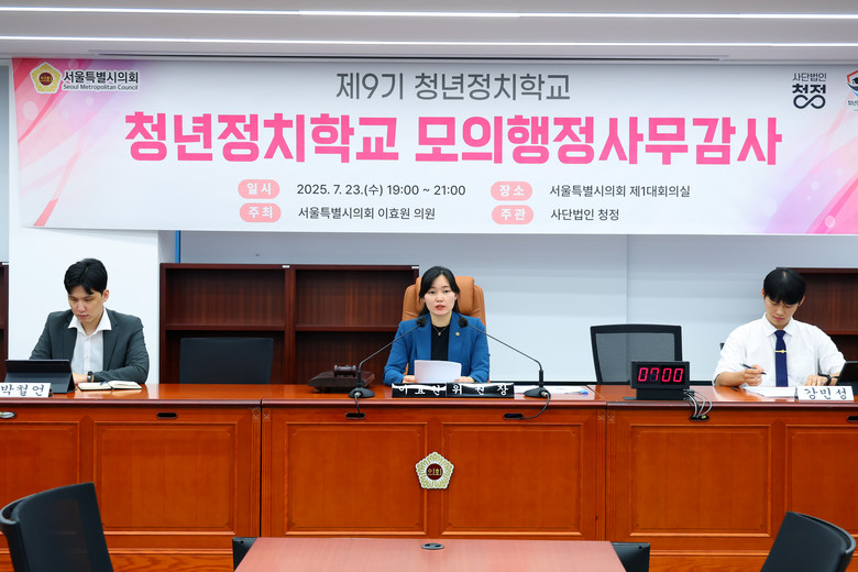 [서울 세계타임즈=이장성 기자] 서울특별시의회 이효원 의원(국민의힘, 비례)이 청년 정치참여의 마중물이 됐다. 지난 23일 서울시의회 제1대회의실에서 열린 ‘제9기 청년정치학교 모의행정사무감사’가 청년들의 뜨거운 참여 속에 성료했다. 해당 감사는 이효원 의원 주최, 사단법인 청정 주관으로 개최됐다.