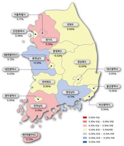 주요 시도별 매매가격은 전남(0.14%), 제주(0.12%), 세종(0.12%) 등은 올랐다 광주(0.00%)는 보합, 경남(-0.11%), 충남(-0.10%), 경북(-0.09%), 울산(-0.06%) 등은 떨어졌다.