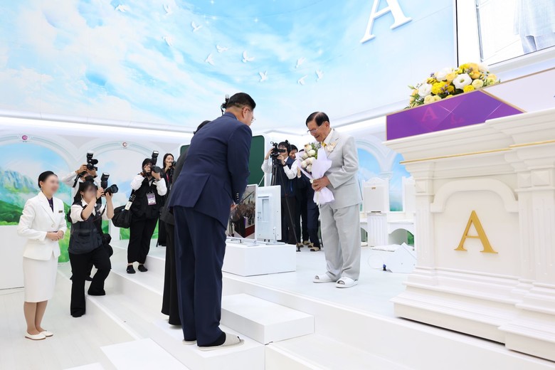 | ▲13일 ‘신천지 전주 전도 대성회’가 신천지 전주교회에서 열린 가운데 참석한 목회자가 이만희 총회장에게 꽃다발을 건네고 있다 [사진 제공 = 신천지 도마지파] |
