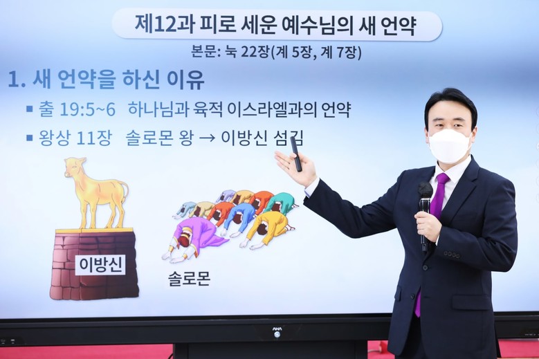 정 강사는 새 언약이라 표현하는 것은 이전 언약이 있었기 때문이라고 했다. 새 언약을 세우시게 된 이유는 출애굽기 19장 5절에서 6절 말씀을 보면 하나님께서 육적 이스라엘과 언약을 하셨는데, 이 백성들이 열왕기상 11장의 내용을 보니 이스라엘의 왕 솔로몬이 첫째 계명이 되는 하나님 외에 다른 신을 섬기지 말라는 약속을 저버리므로 약속은 파해지게 된 것이라고 말했다.