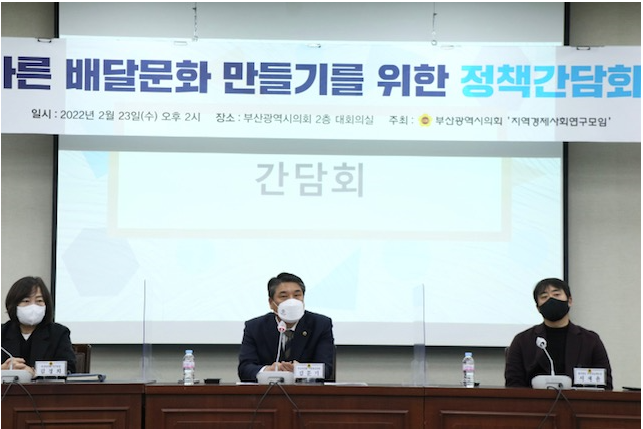 [부산=세계타임즈 이용우 기자] 부산광역시의회 기획재경위원회 김문기 의원(더불어민주당, 동래구3)은 23일 배달노동자들과 부산시 관련부서, 부산지방경찰청 등과 함께 바른 배달 문화 만들기 위한 정책 간담회를 개최하였다.
