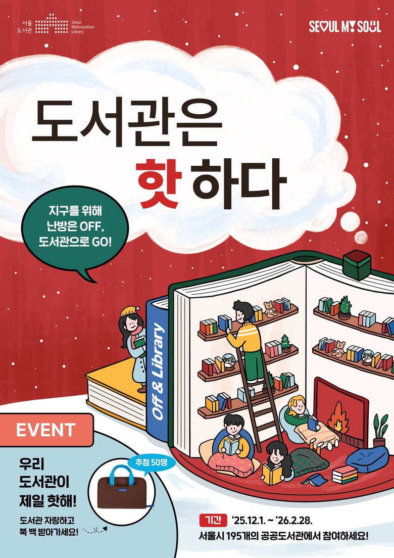 오지은 서울도서관장은 “도서관은 겨울의 추위를 따뜻한 독서로 녹이고 문화를 누리는 가장 ‘핫한’ 공공 공간”이라며 “가정 난방은 잠시 끄고 가까운 도서관에서 따뜻한 책 읽기와 겨울 프로그램을 즐기며, 생활 속 에너지 절감에도 함께 동참해 달라”고 말했다.