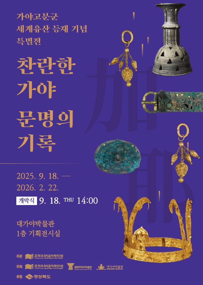 일본을 비롯한 해외 29개국에 흩어져 있는 가야 유산 중 100여 점의 사진 자료를 전시하며, 고령 지산동 고분군을 포함한 세계유산 등재 가야고분군 7곳의 역사적 배경과 유물의 특징을 함께 소개한다.