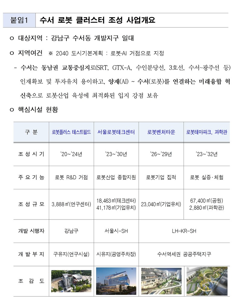 이러한 전략의 핵심 사업으로, 수서역세권 일대를 로봇・AI 산업의 핵심 거점으로 조성하는 ‘수서 로봇클러스터 조성 사업’을 본격 추진하고 있다. 수서 로봇클러스터는 로봇 연구개발(R&D)부터 실증, 기업 집적, 시민체험까지 아우르는 앵커 시설을 2030년까지 단계적으로 구축해, 피지컬 AI 기반 로봇산업의 중심지로 육성하는 것이 목표다.