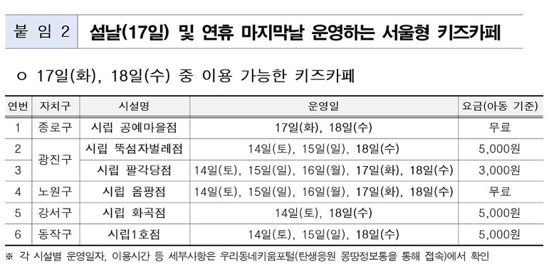 아울러 김영옥 위원장은 “설 연휴 동안 아이들과 즐거운 시간을 보낼 수 있도록 서울 전역 곳곳에서 ‘서울형 키즈카페’가 운영되며, 가족을 만나러 서울에 올라오는 다른 지역 주민도 서울 시민인 가족과 동반하는 경우 ‘서울형 키즈카페’를 이용할 수 있는 만큼 아이들과 가족들 모두 즐거운 명절을 보내시길 바란다”라고 밝혔다.