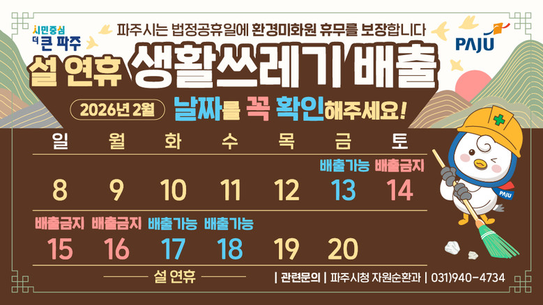 심재우 자원순환과장은 “설 연휴 기간에는 생활 쓰레기 수거가 일시 중단되는 만큼, 안내된 배출일과 시간을 지켜주시면 연휴 기간 청결 유지와 수거체계 운영에 큰 도움이 된다”라며 “시민 여러분의 이해와 협조를 부탁드린다”라고 말했다.