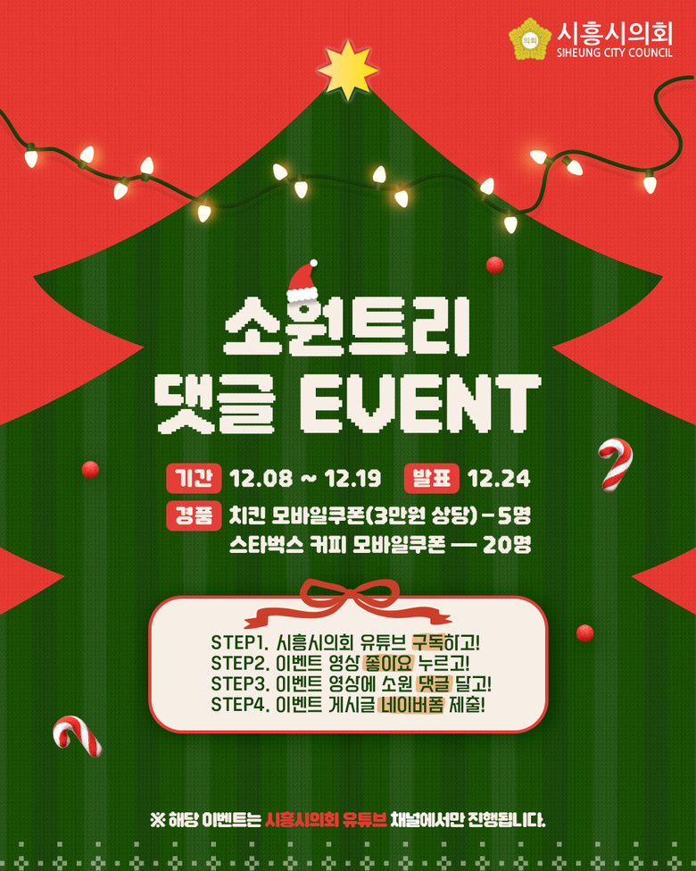 이벤트 참여 방법은 간단하다. 시흥시의회 공식 유튜브 채널을 ‘구독’하고 영상에 ‘좋아요’를 누른 뒤, 댓글로 나만의 소원을 작성하면 된다. 이후 영상 설명란이나 댓글에 게시된 방법을 통해 참여 인증을 하면 응모가 완료되며, 당첨자는 12월 24일 발표된다.