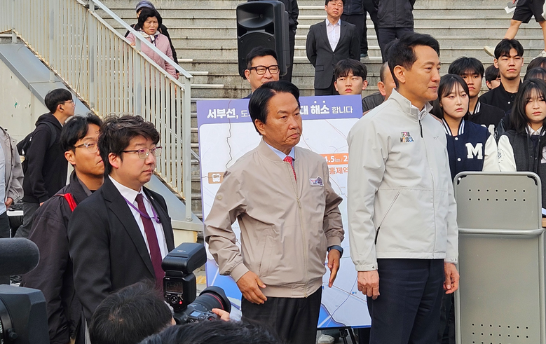 | ▲ 명지대학교 앞에서 여장권 교통실장에게 서부선 관련 브리핑을 경청하는 오세훈 서울시장(우), 이성헌 서대문구청장(중), 문성호 서울시의원(좌) |